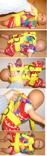 Folgende Babytragegurte wurden von einer Mutter zur Verfügung gestellt, die aufgrund einer Conterganschädigung ihre Kinder nicht mit den Armen tragen konnte und deshalb diese Gurte selbst entwickelt hat. Auch für Eltern mit Halbseitenlähmung oder RollstuhlfahrerInnen ist dies ein gutes Hilfsmittel, um ihre krabbelnden Kinder leichter einhändig vom Boden hochheben zu können. Wir können 5 Tragegurte in verschiedenen Größen verleihen.
